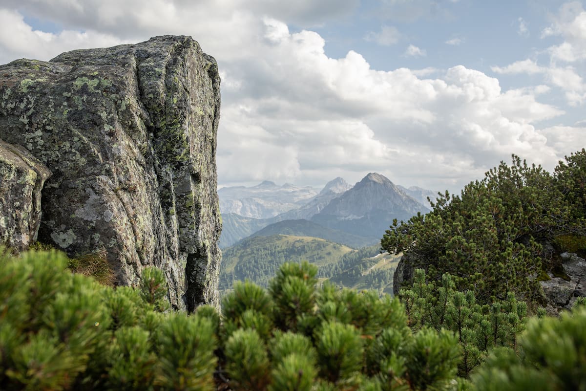 Nach einem gehaltvollen Frühstück startet ihr von der SchüttAlm über die Forststraße nach oben Richtung Frauenalmsattel. Dann geht es links bergauf und ihr umrundet den Ahornkopf bis zur Weggabelung. Rechts mit Blick auf Dachsteinmassiv und Bischofsmütze, links der Großglockner und vor euch habt ihr immer das Hochkönigmassiv. Wunderschön!